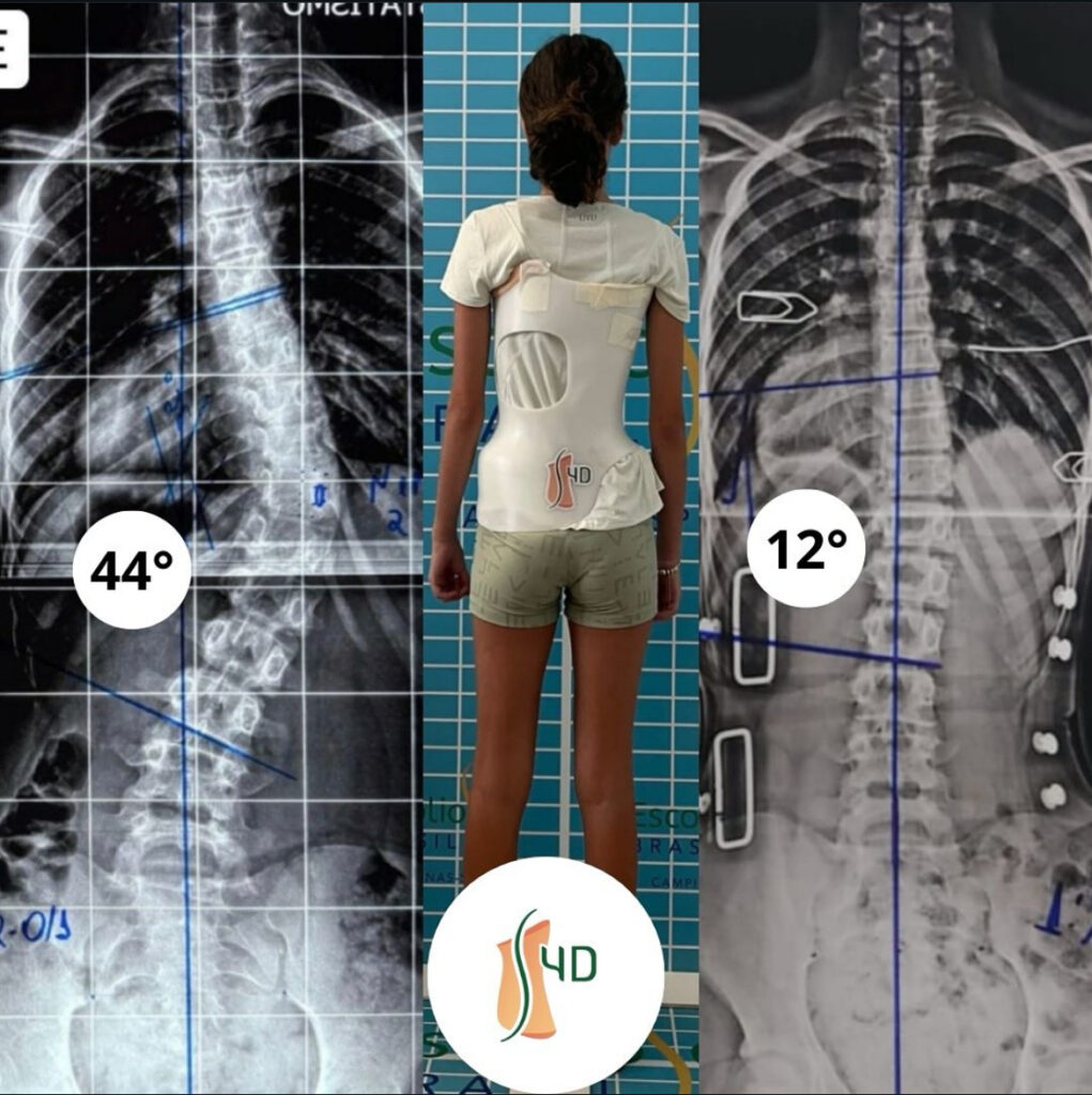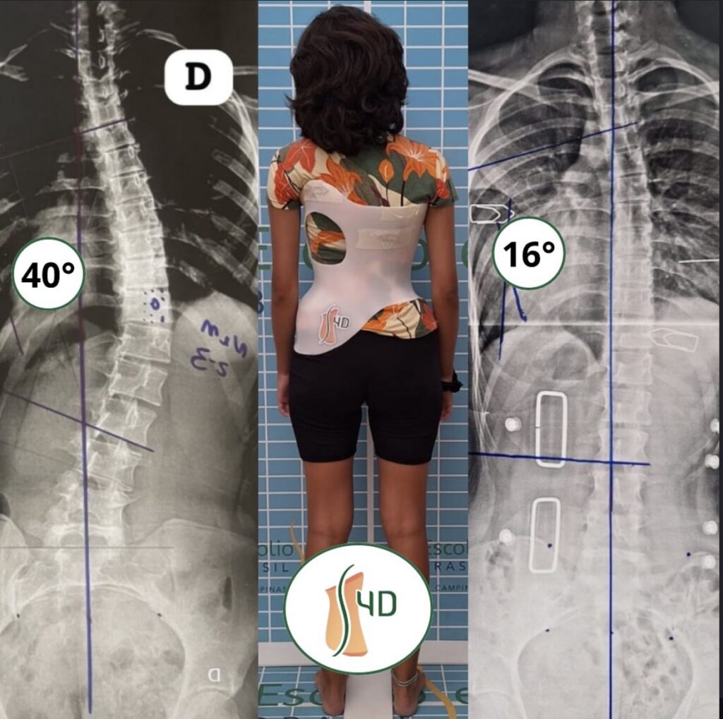 Esta paciente chegou no início da fase do crescimento e com uma curva lombar significativa de 40º. A evolução natural da doença era que este grau aumentasse durante o crescimento com o risco da cirurgia. Com o tratamento conservador de exercícios específicos e Colete S4D ela reduziu a curvatura lombar para 12º e torácica para 5º, eliminando o risco de cirurgia.