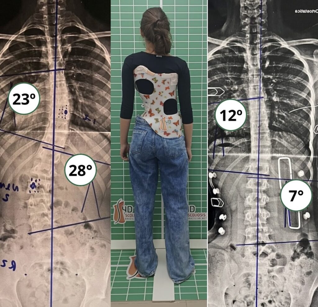 Esta paciente apresentava uma falta de alinhamento significativa que atrapalhava atividades funcionais básicas do dia a dia. Com colete e exercícios específicos ela reduziu 19º da curvatura lombar e 12º da curvatura torácica ficando muito mais alinhada, recuperando as atividades funcionais. O risco de cirurgia foi afastado.