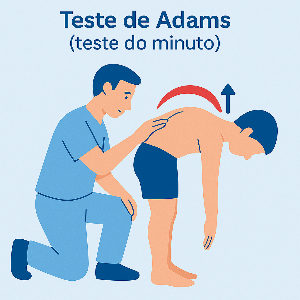2. Teste de Adams (teste do minuto): o paciente se inclina para frente; se houver um lado mais alto das costas (gibosidade), há suspeita de rotação vertebral;
