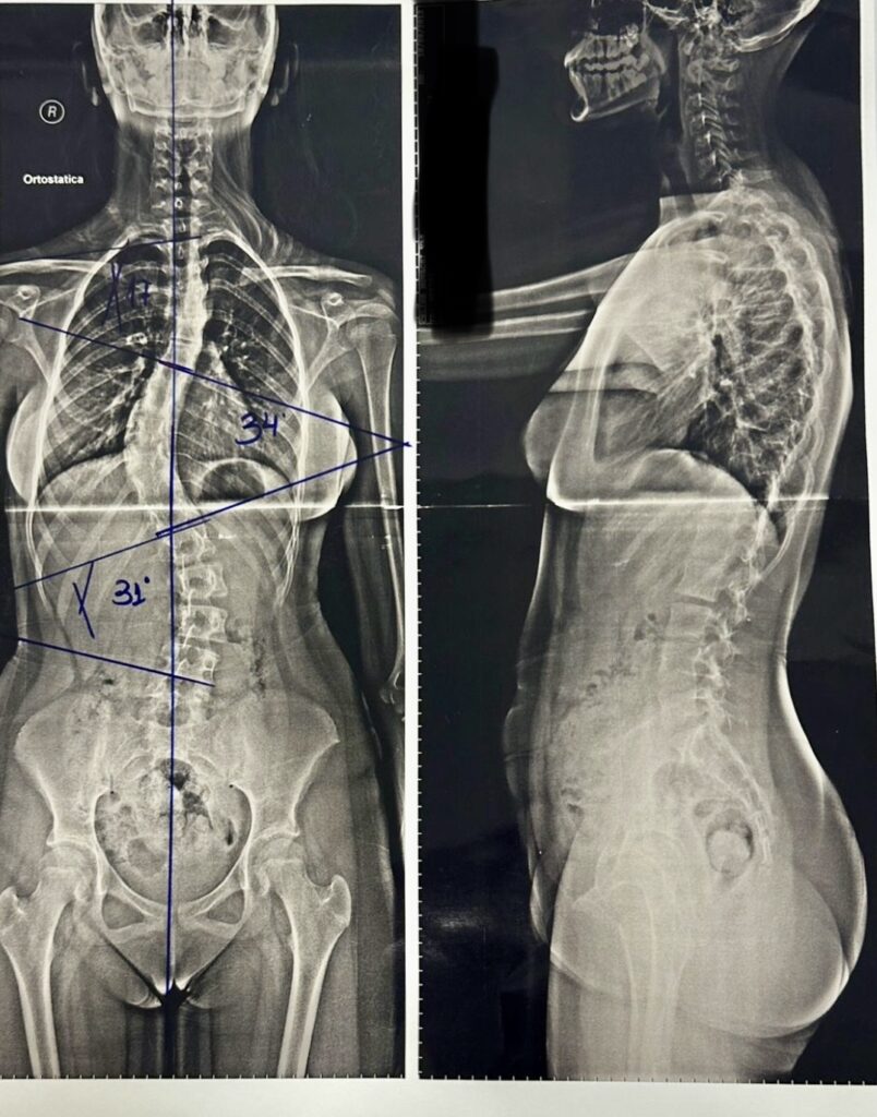Uma adolescente foi diagnosticada tardiamente com 16° de curva em um exame de raio-X de tórax. Sem acompanhamento e orientação adequada, sua curva evoluiu para mais de 60°, tornando-se caso cirúrgico.